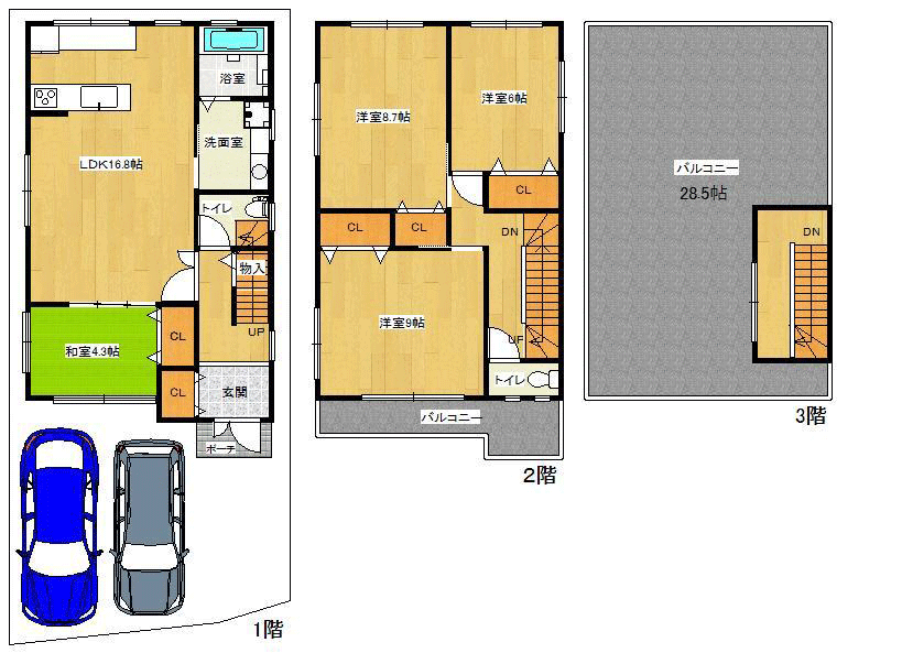 ●延床面積/113㎡(1階53.87㎡ 2階52.65㎡ スカイプロムナード 46.17㎡)