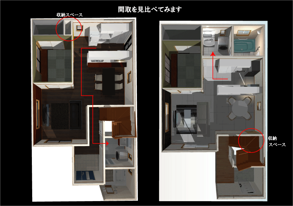 2つの間取の広さはほぼ同じです ・家事動線に特徴が出てきます。左側の間取はキッチンからは、いったん廊下に出て洗面室へ、右側の間取はキッチンからドア一枚で洗面室へ。右側の間取は便利に思いますが、来客の多い家庭では、2階に寝室があるとどうしてもダイニングリビングを通らないと洗面室、お風呂へ行くことが出来ません(ー_ー)!! ・収納部分にも違いがあります。左側の間取はキッチンのすぐ横に、右側の間取はダイニング 側に収納庫があります。キッチンのすぐ横にある場合はパントリーとして利用すると便利ですね。