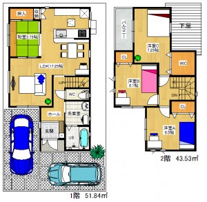 ●延床面積/95.37㎡ 1階51.84㎡ 2階43.53㎡(1号地)