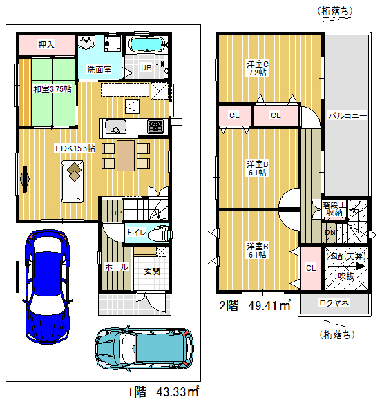●延床面積/92.74㎡ 1階49.41㎡ 2階43.33㎡(2号地)